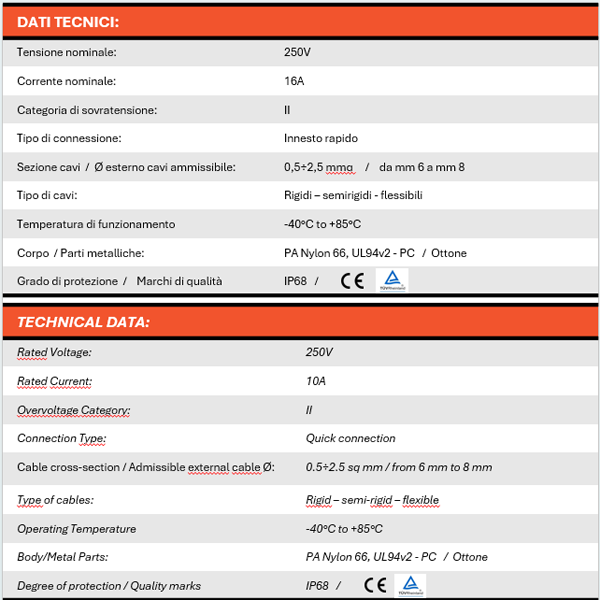I connettori per cavi multipolari da esterno, particolarmente adatti per impianti di illuminazione, offrono notevoli vantaggi nell’esecuzione di giunzioni in aree particolarmente umide. La classe di protezione IP68 e la connessione dei singoli fili con attacco rapido a levetta garantiscono notevole facilità, sicurezza e velocità’ nell’esecuzione dei collegamenti.
