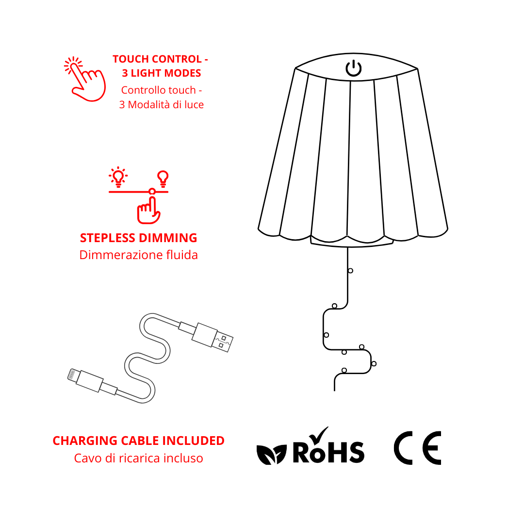 La luminosità regolabile senza scatti garantisce un controllo preciso della luce, evitando abbagliamenti e creando sempre l’atmosfera desiderata. La batteria al litio ricaricabile consente un utilizzo completamente senza fili, eliminando ingombri e prese di corrente: la lampada può essere posizionata ovunque con la massima libertà.