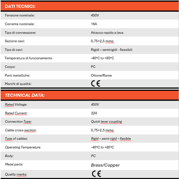 Morsetto/connettore maschio-femmina (presa-spina) con attacco rapido a leva 5 POLI