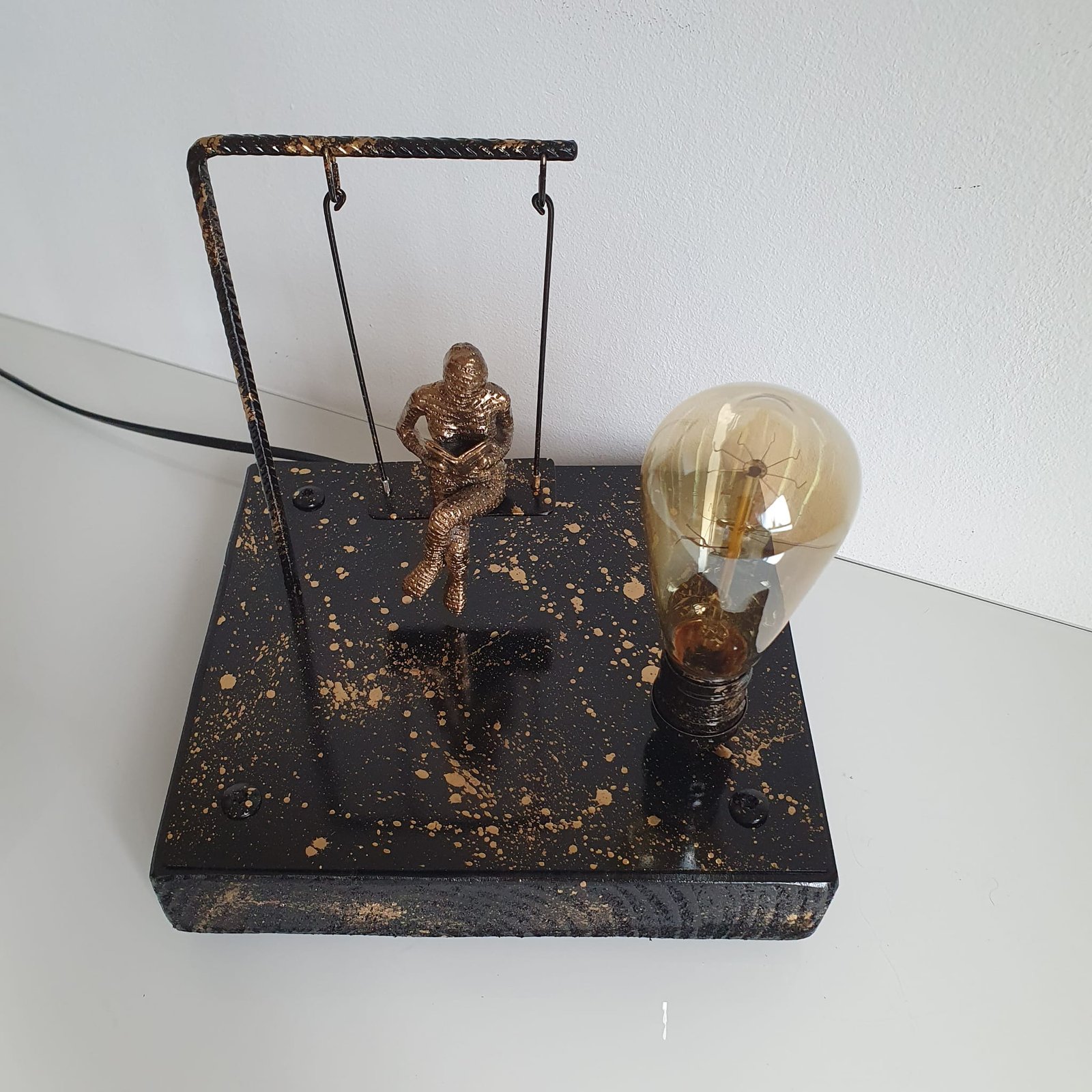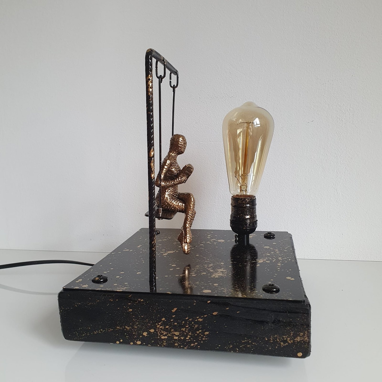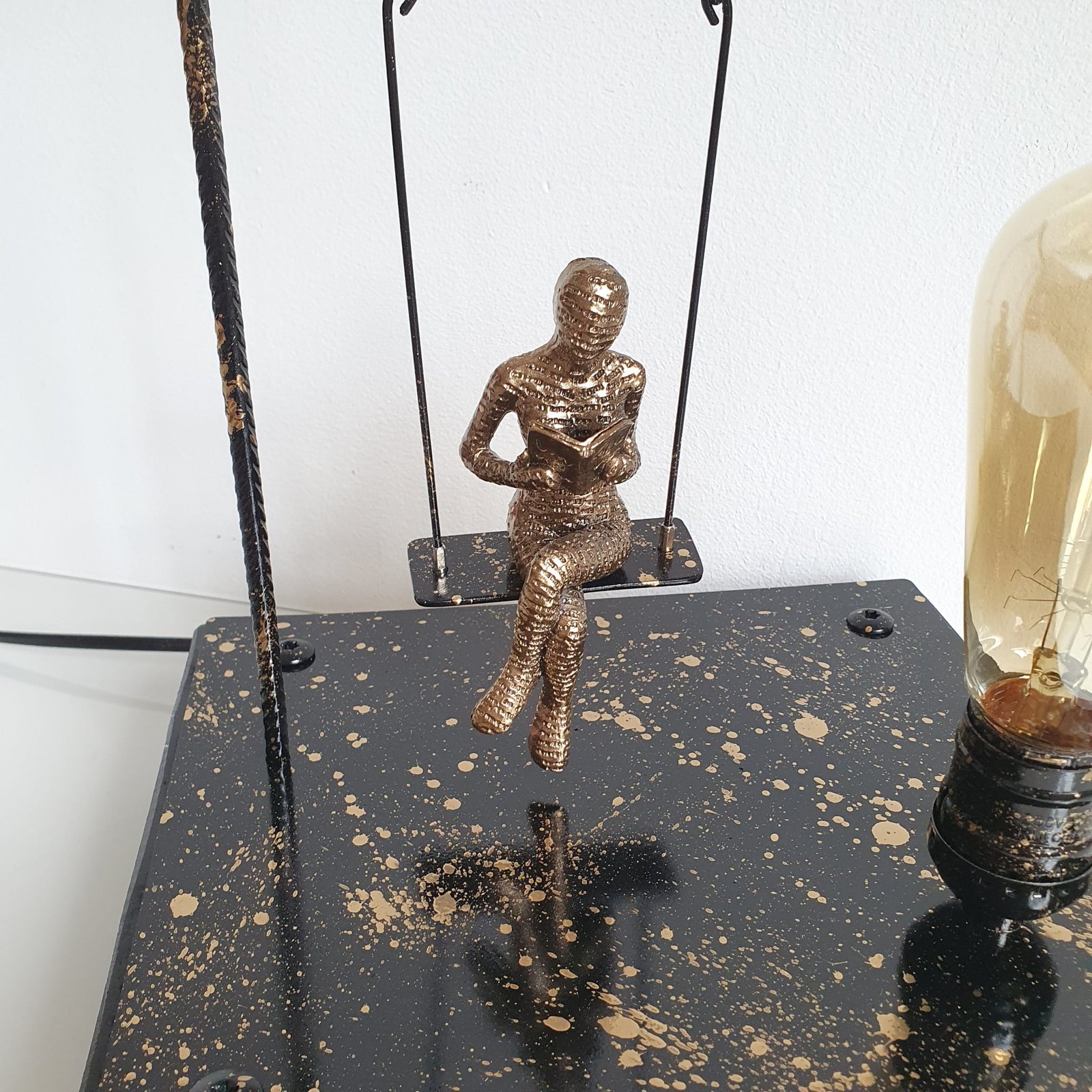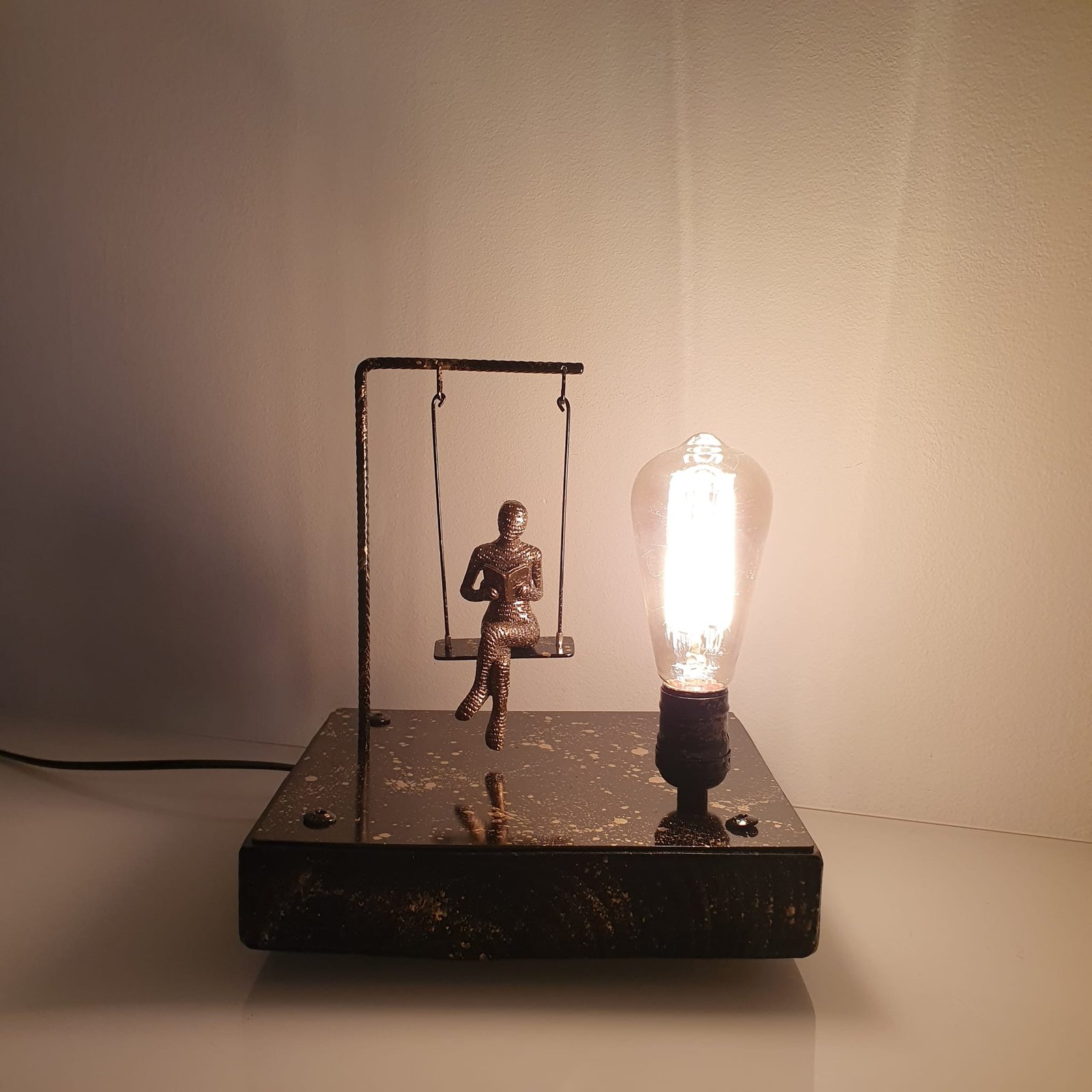Lampada artistica con figura femminile in resina su altalena in metallo, ideale per arredare salotti, camere da letto, studi e spazi creativi.