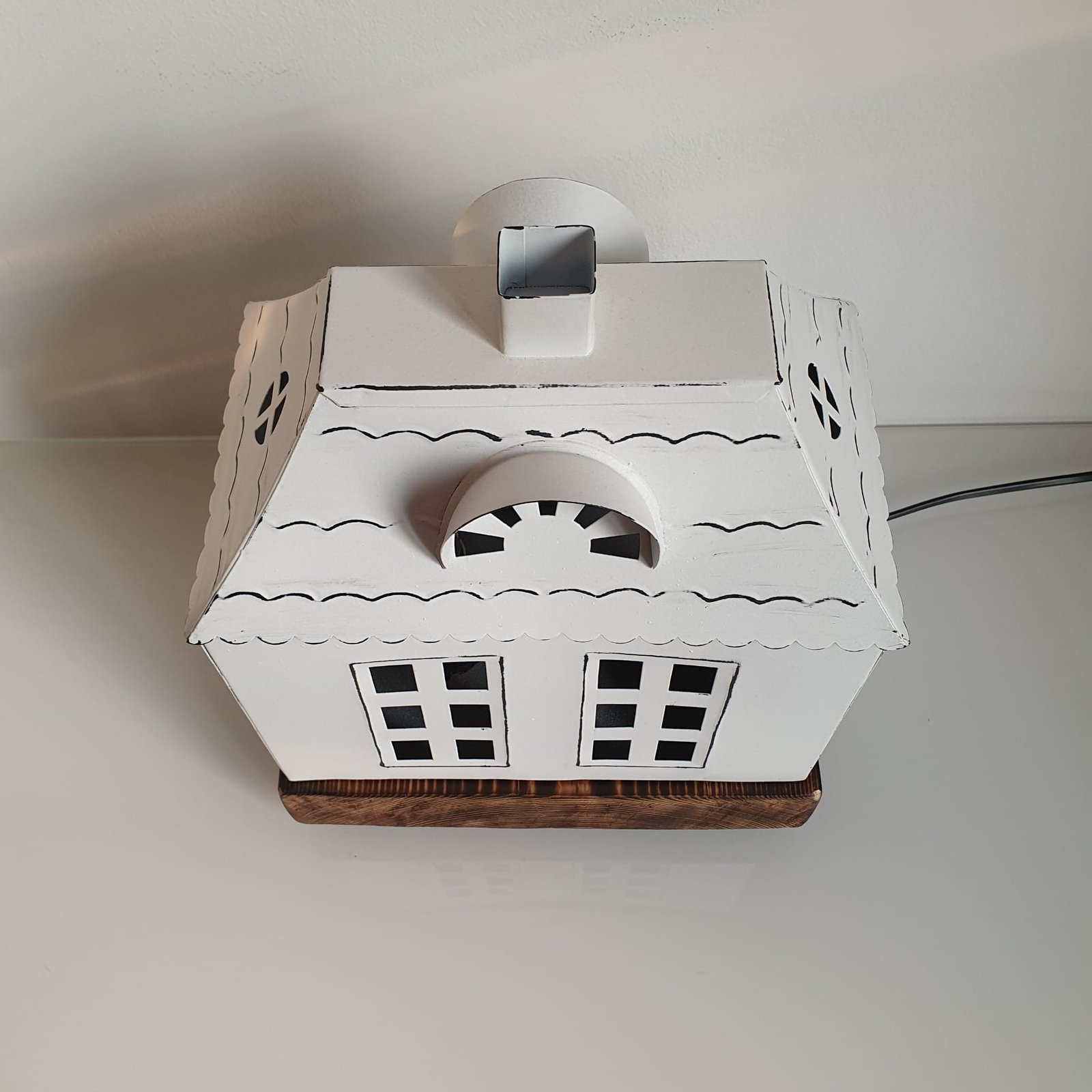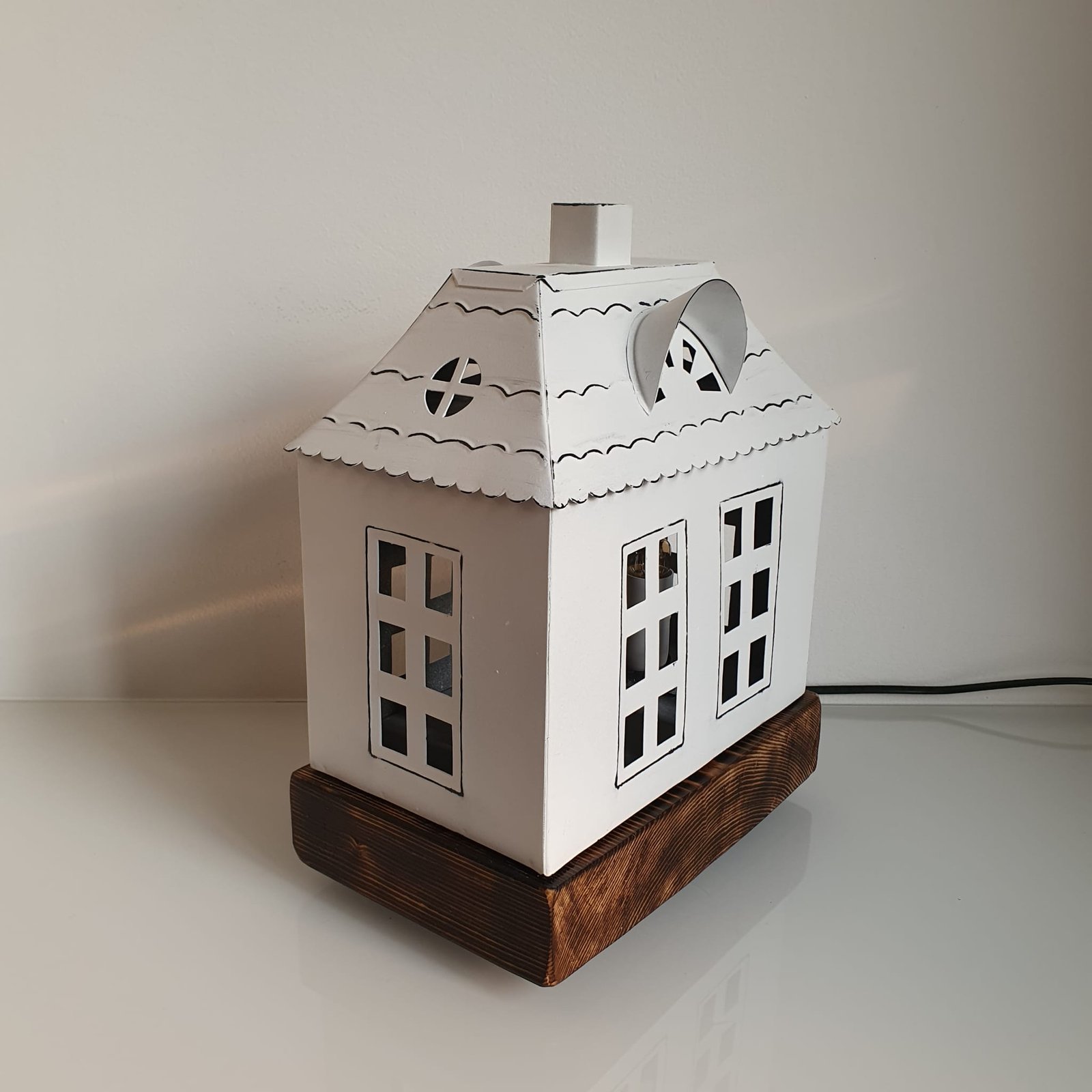 White House è una lampada artistica a forma di piccola casa realizzata in metallo, montata su una solida base in legno.